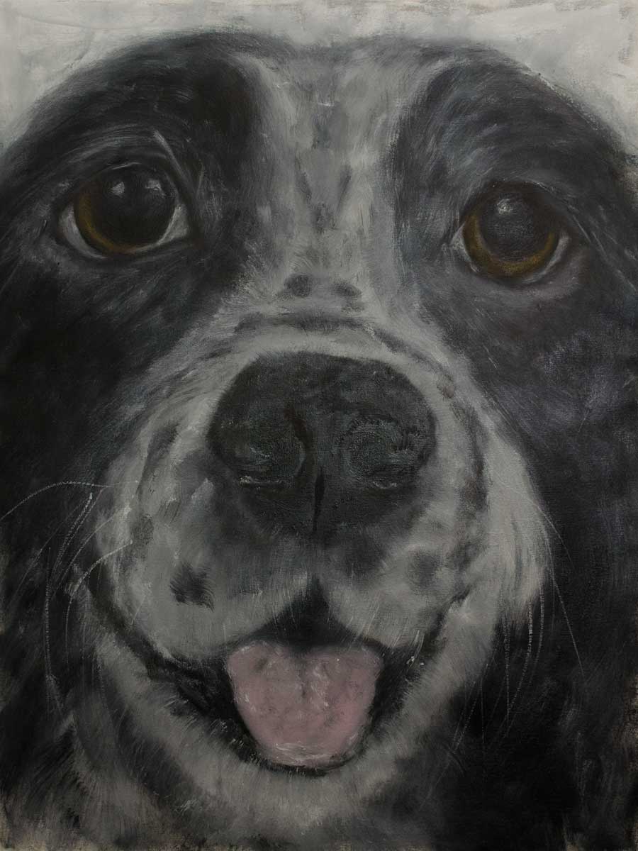 The close composition invites the viewer into an intimate moment of connection. Soft brushwork and subtle tonal contrasts bring life to the dog’s fur, while the bright, joyful expression radiates warmth and positivity.